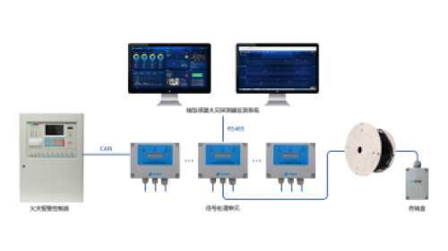 纜式線型感溫火災探測器具有豐富的對外通訊端口,可通過多種方式與上位機進行配給通訊。可以通過無源觸點上傳公共火警、故障信息;可以直接通過回路總線上傳感溫電纜的分布(或是分區(qū)報警信息),可通過RS485總線與感溫電纜檢測系統(tǒng)配接,上傳感溫電纜的各種屬性信息、閾值設置信息、感溫電纜感知到的現(xiàn)場實時溫度信息,在檢測平臺上通過圖形化的方式進行呈現(xiàn);