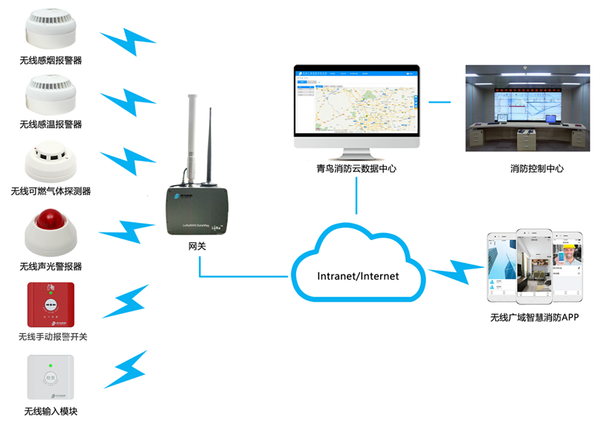 采用基于物聯(lián)網(wǎng)技術(shù),運用云計算、大數(shù)據(jù)的全新智慧防火系統(tǒng)解決方案,在建筑物內(nèi)配備健全的物聯(lián)網(wǎng)化的消防設備,實時在線監(jiān)測現(xiàn)場消防設備的運行情況,可將所有火警信息通過有線或4G網(wǎng)絡(由于校園網(wǎng)通常為內(nèi)部專網(wǎng),網(wǎng)關無法自動獲取IP地址,因此推薦網(wǎng)關選擇4G作為上行信道)直接上傳至青鳥消防云平臺,平臺將報警信息通過手機APP、電話、短信等方式及時通知相關負責人,便于消防隱患及時處置,能夠真正的提高校園消防安全管理的能力,有效防范火災事故的發(fā)生,極大程度地保障校園學生的生命和財產(chǎn)安全。